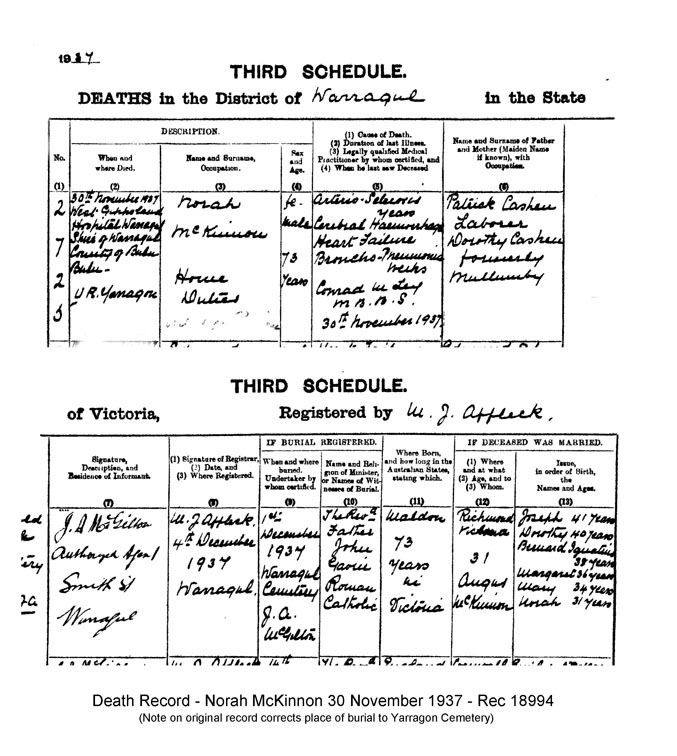 All of Angus and Norahโs children married producing nineteen grandchildren. In the final years of her life Norah lived with her daughter Dora Roche in the Yarragon district. Norah died on 30 November 1937.