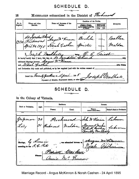 Norah married Angus MacKinnon at St Ignatius Church Richmond on 24 April 1895. At the time of her marriage she records her place of residence as being Fitzroy.